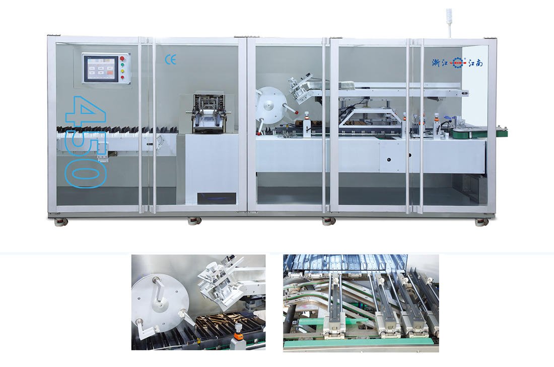 说明书自动折叠输送( 1-4折) ;物料自动分料、供料;纸盒自动展开,说明书、物料自动装盒;同步打批号(三排);纸盒自动封口;废品自动剔除。适用于铝塑泡罩药版、针剂托盘、瓶类、软膏类及矩形或片状物品的自动装盒。
